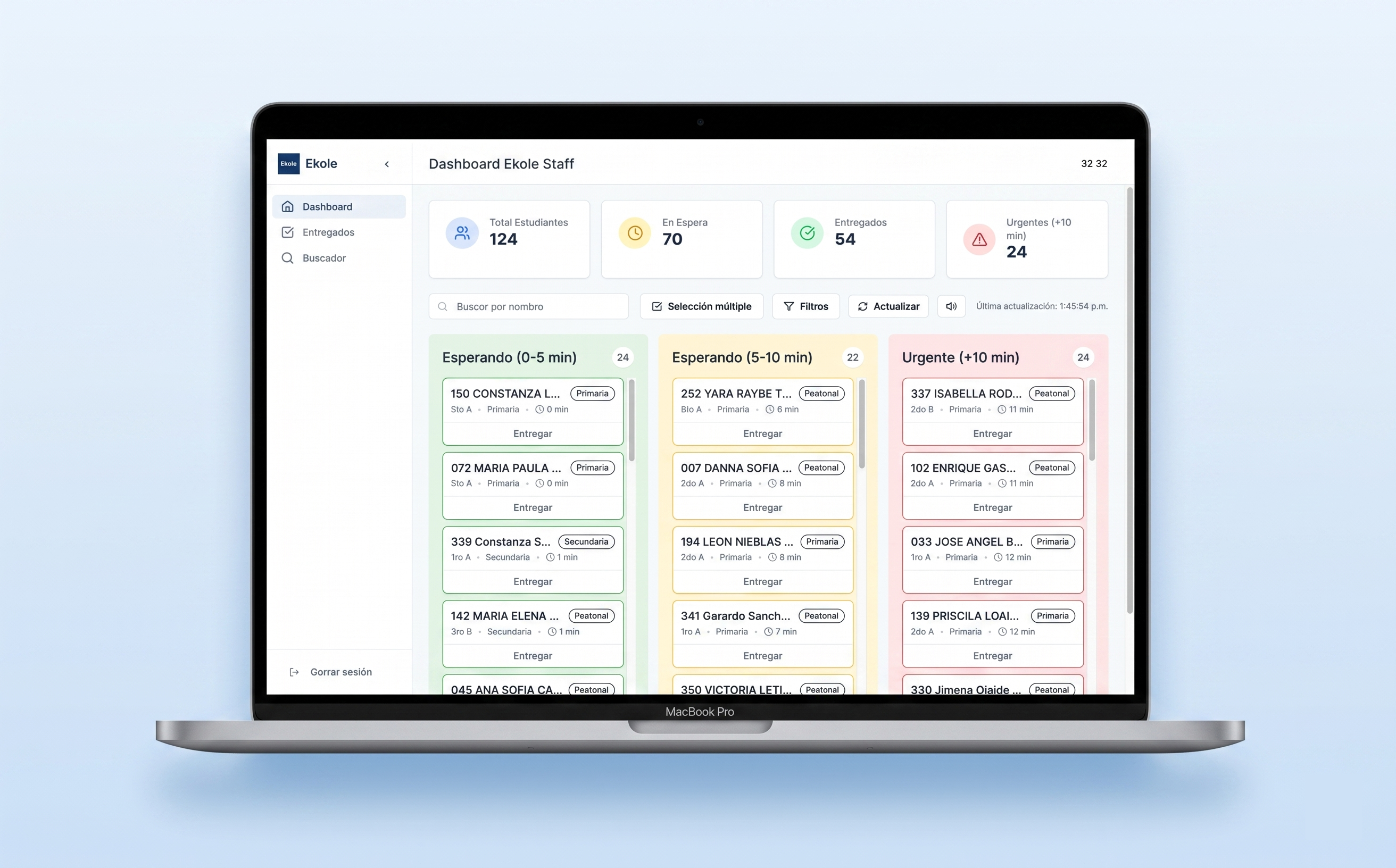 Olvídese de las filas, el altavoz y los grupos de WhatsApp. Ekole despacha más rápido y registra cada salida automáticamente — sin que un solo padre descargue nada.